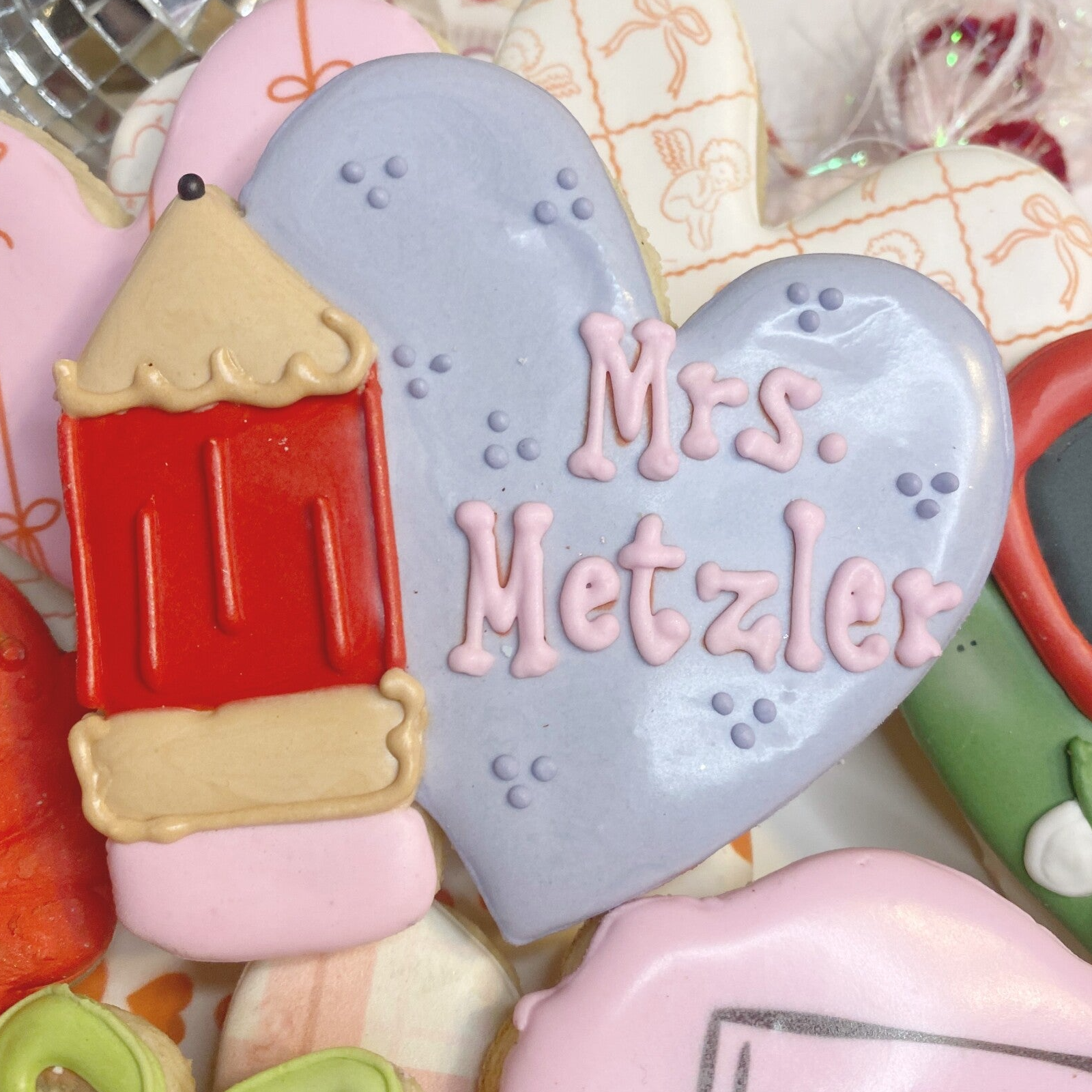 Write Teacher For Me Cookie. All cookies are heat sealed in clear bags for freshness. Please check out our instagram for packaging pictures. Please fill out the form below for all personalizations. Only the heart and pencil cookie can be personalized.